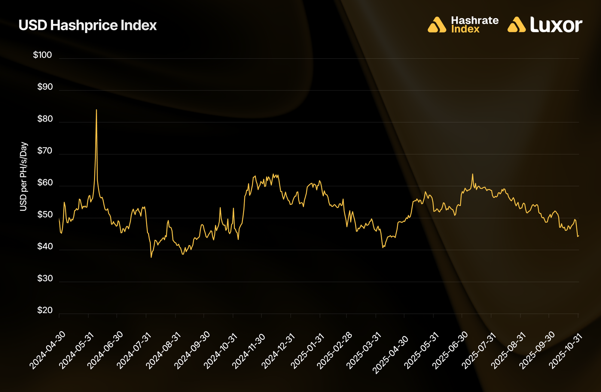 Just like the block subsidy halving, difficulty-driven declines in BTC-denominated rewards don’t always translate to lower USD revenue. When Bitcoin’s price rises alongside difficulty, miner profitability can hold steady or even improve. Since the 2024 halving, USD-denominated hashprice is roughly flat at $45 per PH/s/Day.