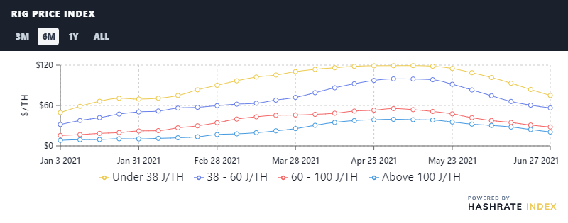 Newer and next generation machines (which consumer 38-60J/TH and 38J/TH, respectively) lost some 32% of their re-sell value over the month of June. Older machines in 60-100 J/TH also lost 32%, while the oldest machines in our index (over 100J/TH) fell the most at 36%.