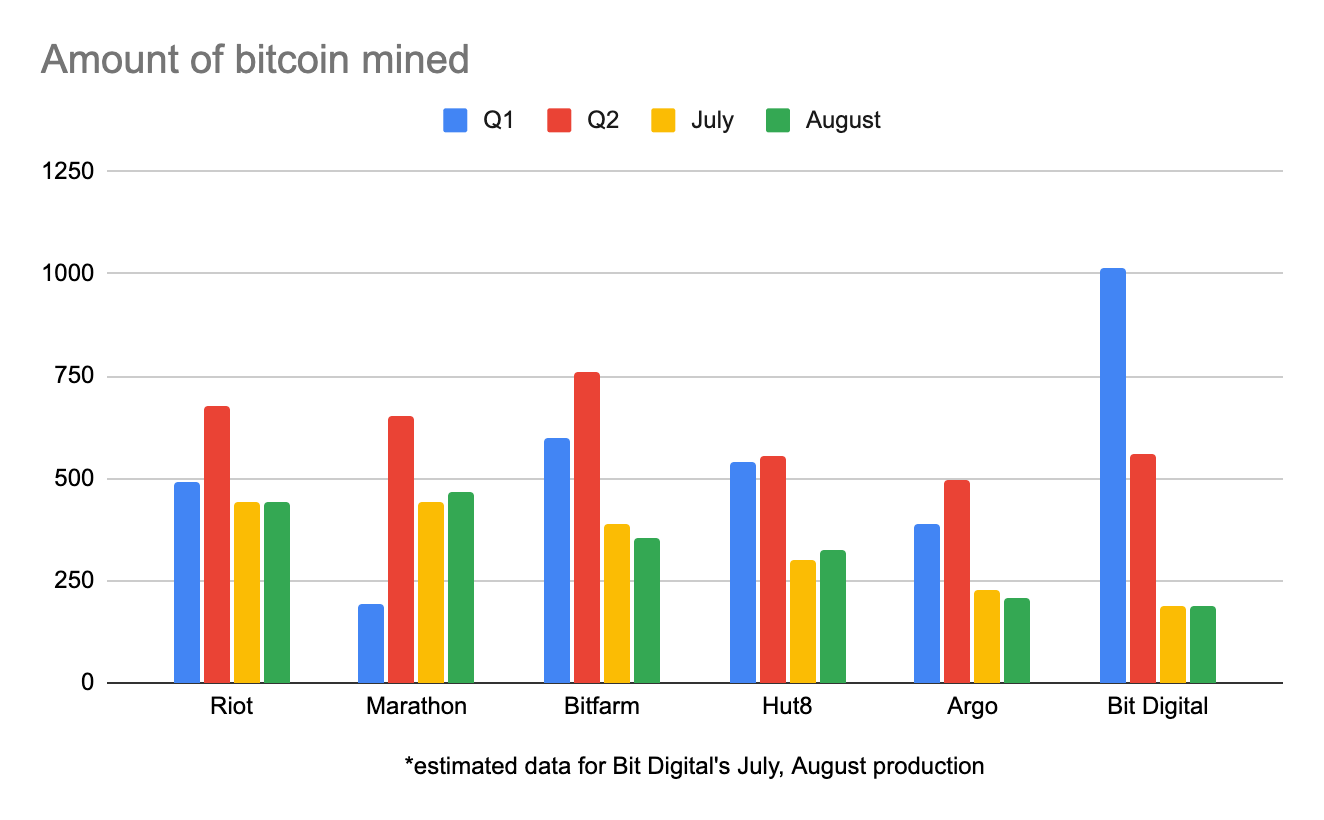 The biggest bitcoin miners in the Americas collectively mined 1,796 in August, as production matched or succeeded what they mined in July, another record-breaking month. This amped-up production comes, in part, from the sped-up block times we saw in August from Bitcoin’s difficulty having a hard time keeping up with the tidal wave of hashrate hitting the network in the wake of China’s mining crackdown.