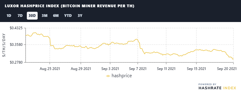 Mining metrics are down, down, down in step with Bitcoin this week, as a macro market downturn has taken hold in the wake of the evolving Evergrande implosion.