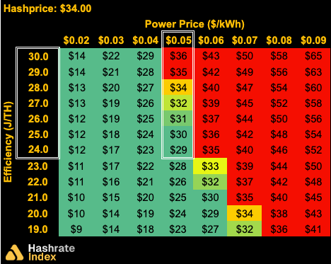 The hashcost curve below visualizes this efficiency unlock. At a $34 hashprice, stock firmware at 29.5 J/TH fails to break even with $0.05/kWh power. But with LuxOS, underclocking to 24.0 J/TH drops this hashcost to $29, pushing that shutdown threshold away.