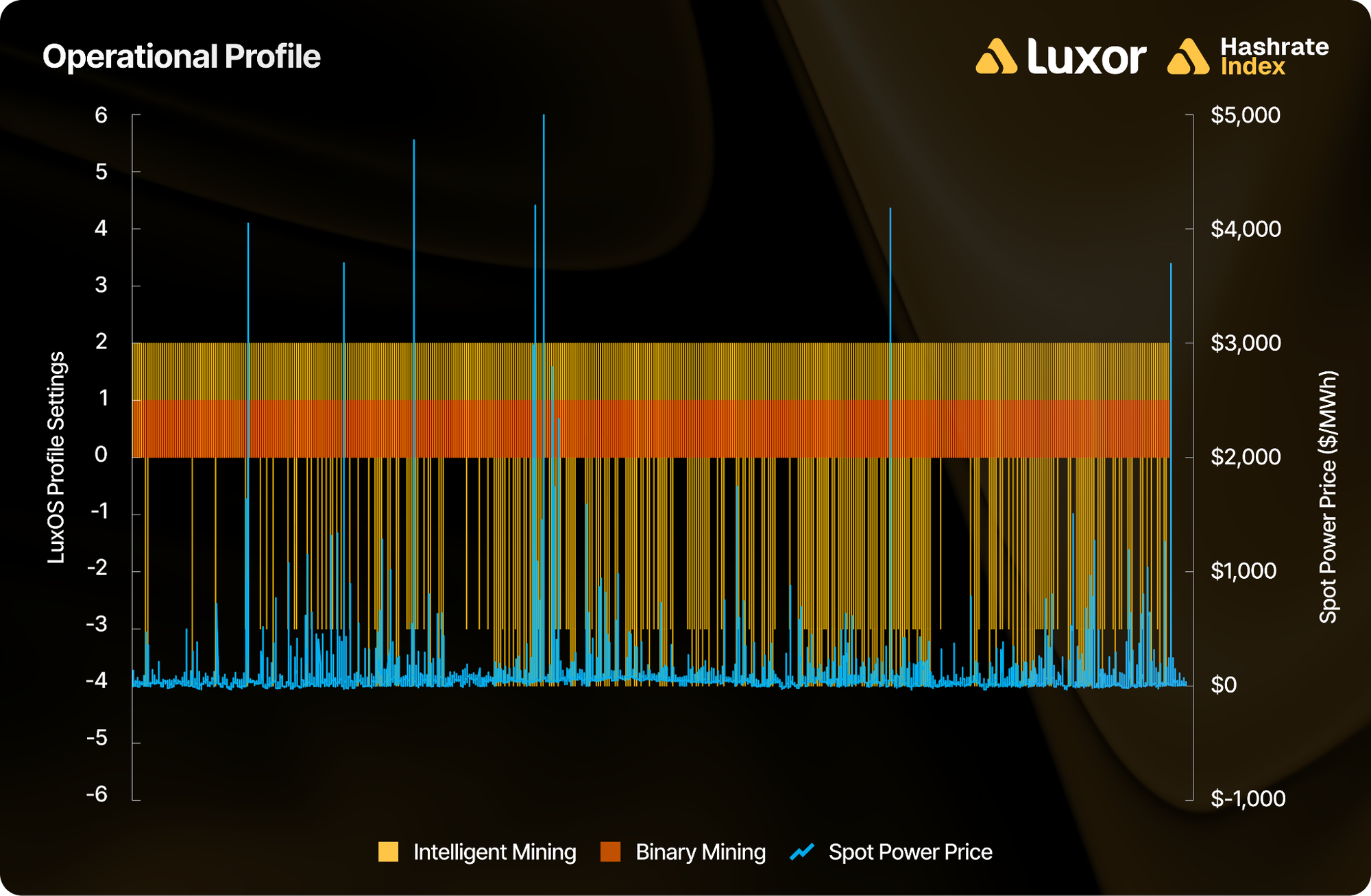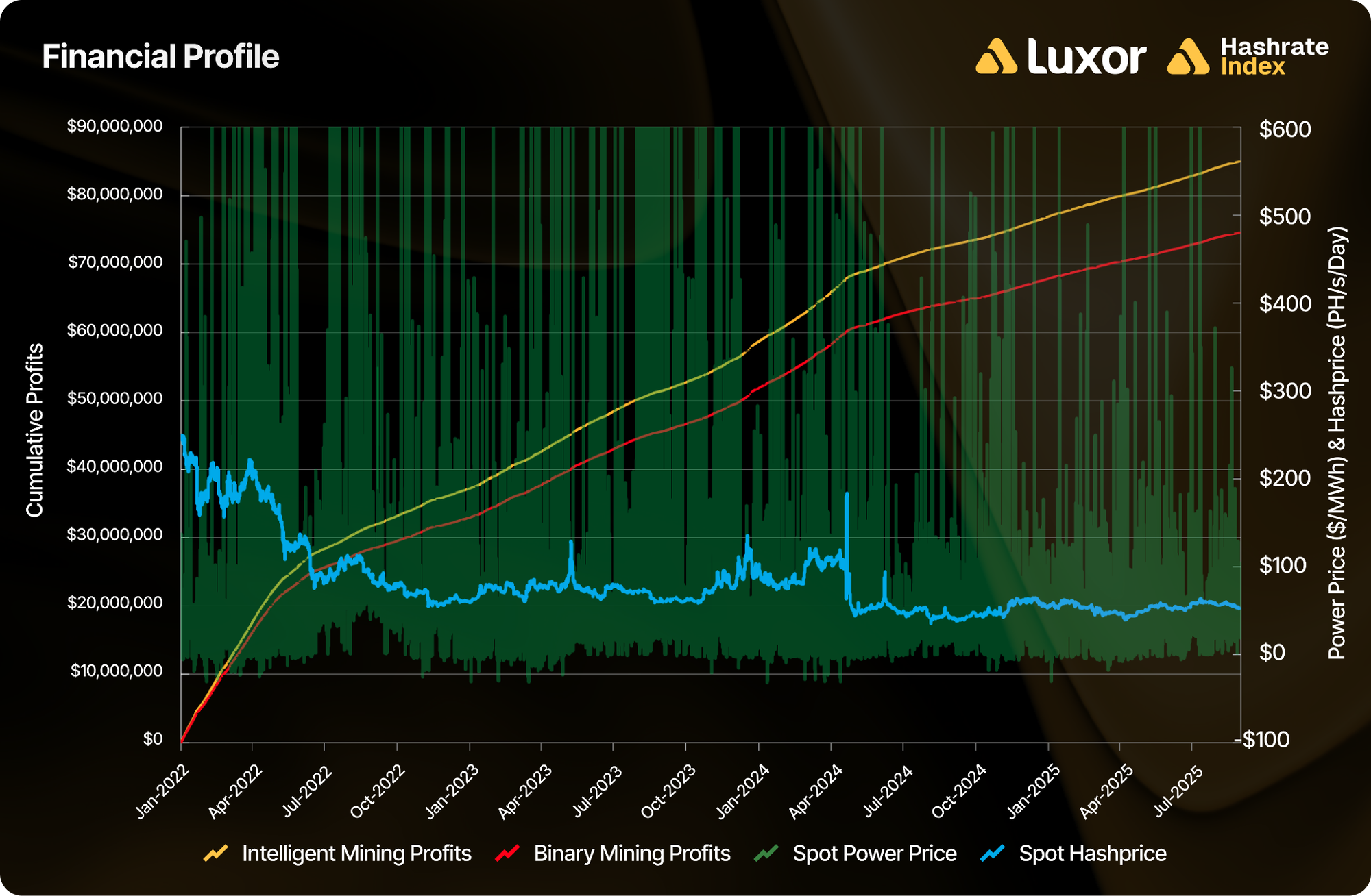 ⚠️ Disclaimer: The profitability figures in this case study reflect gross margins relative to electricity costs only. They exclude other major expenses such as hardware capex, infrastructure buildout, labor, operations & maintenance, depreciation, and financing costs. In practice, once these factors are included, net margins are significantly lower. This simplified case study is designed to isolate and illustrate the impact of Intelligent vs. binary mining decisions.