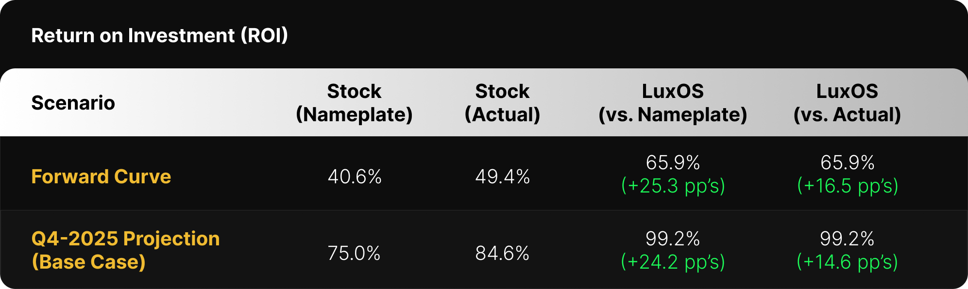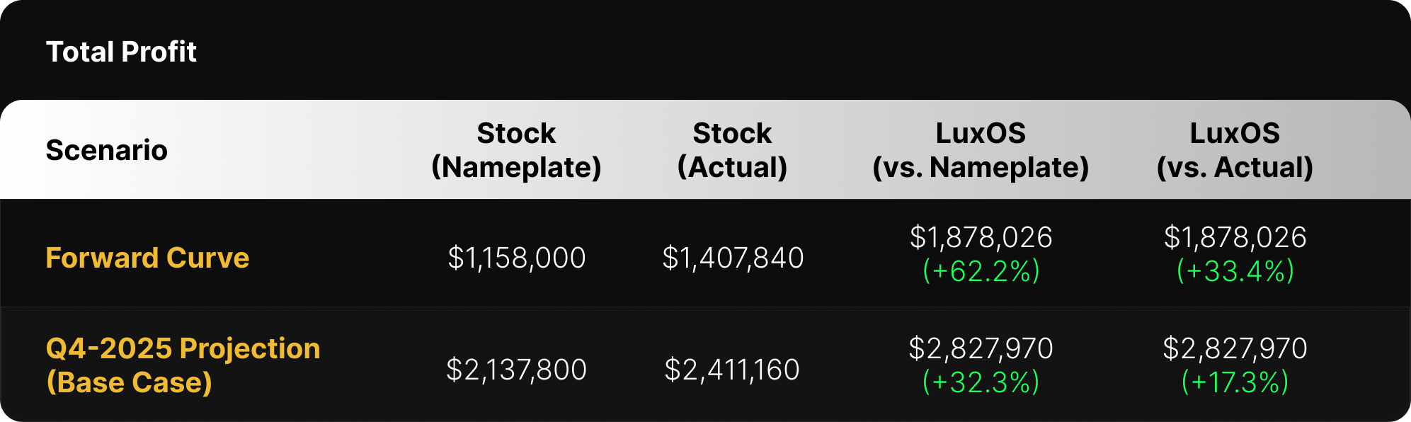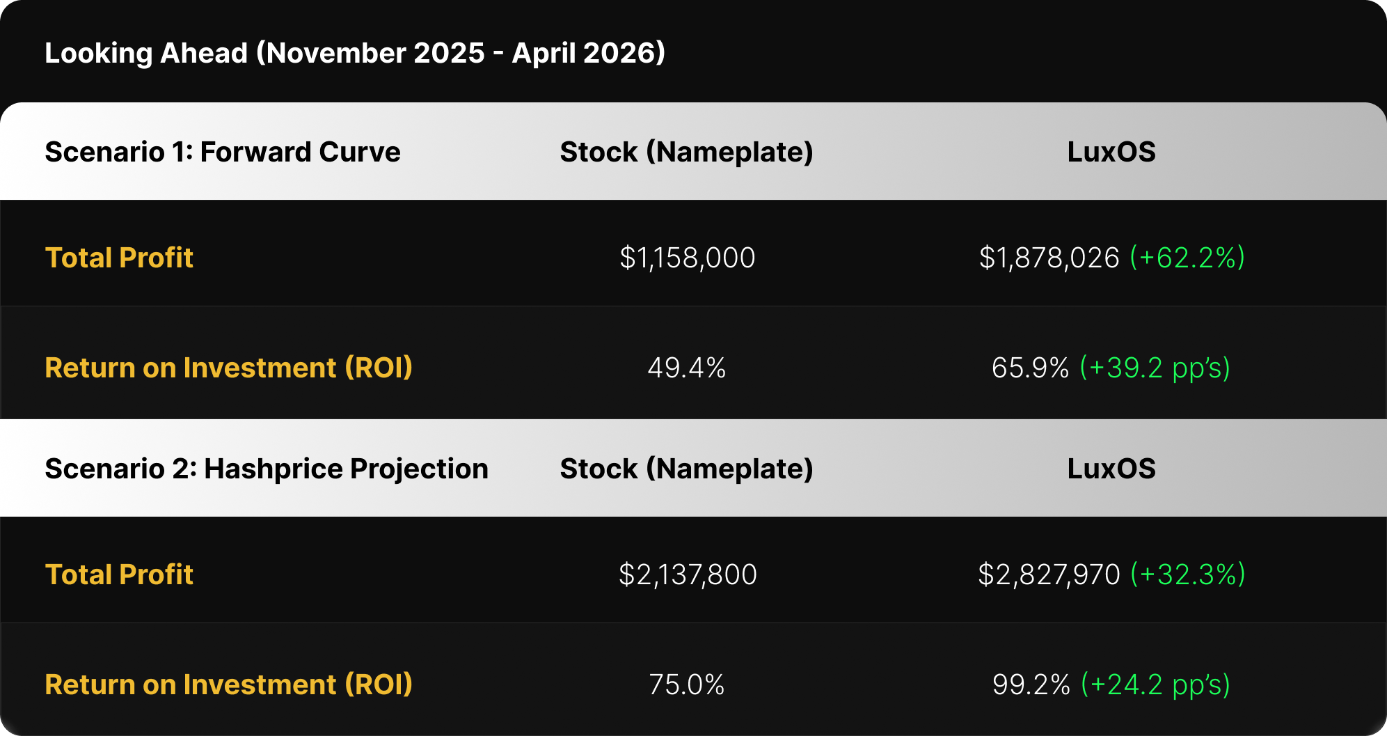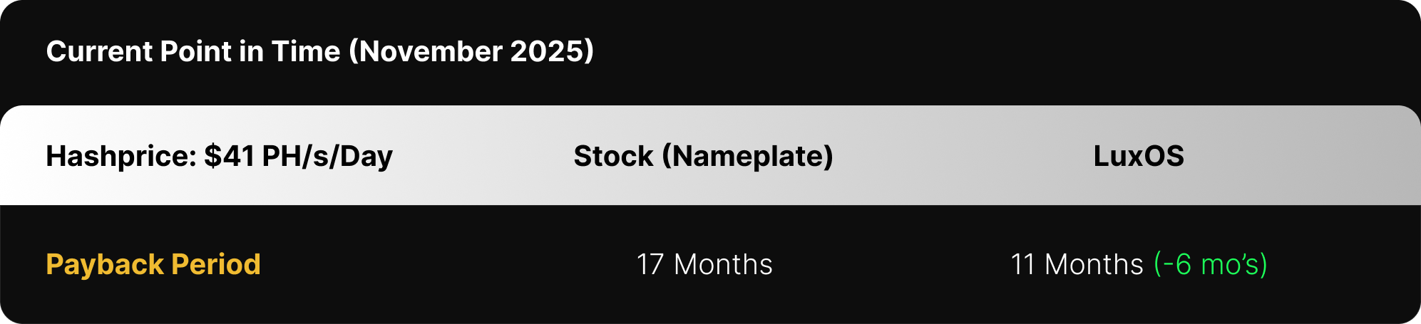 In practical terms, this cost reduction translates to higher net profit per TH, even in flat or declining hashprice environments. As shown in the table above, net profit climbs from $2.48 (Stock) to $2.96 (LuxOS Default) and peaks at $3.02 (-6 Profile) — all without any change in external market conditions.