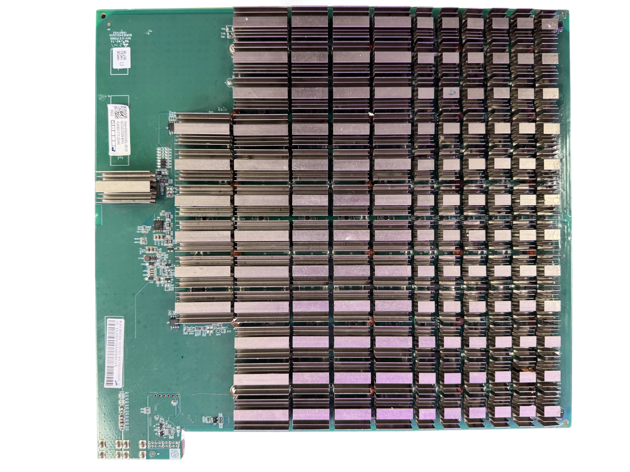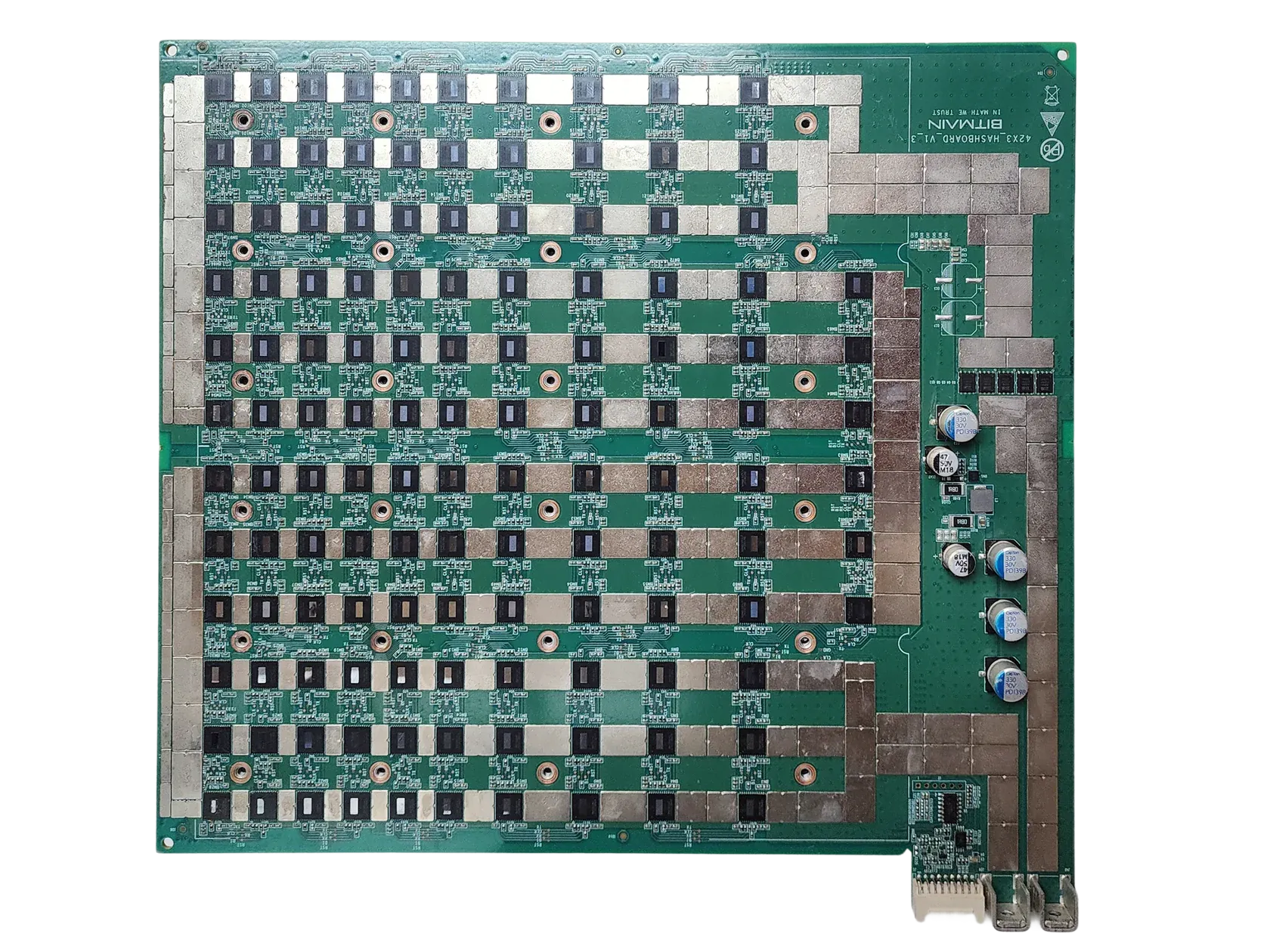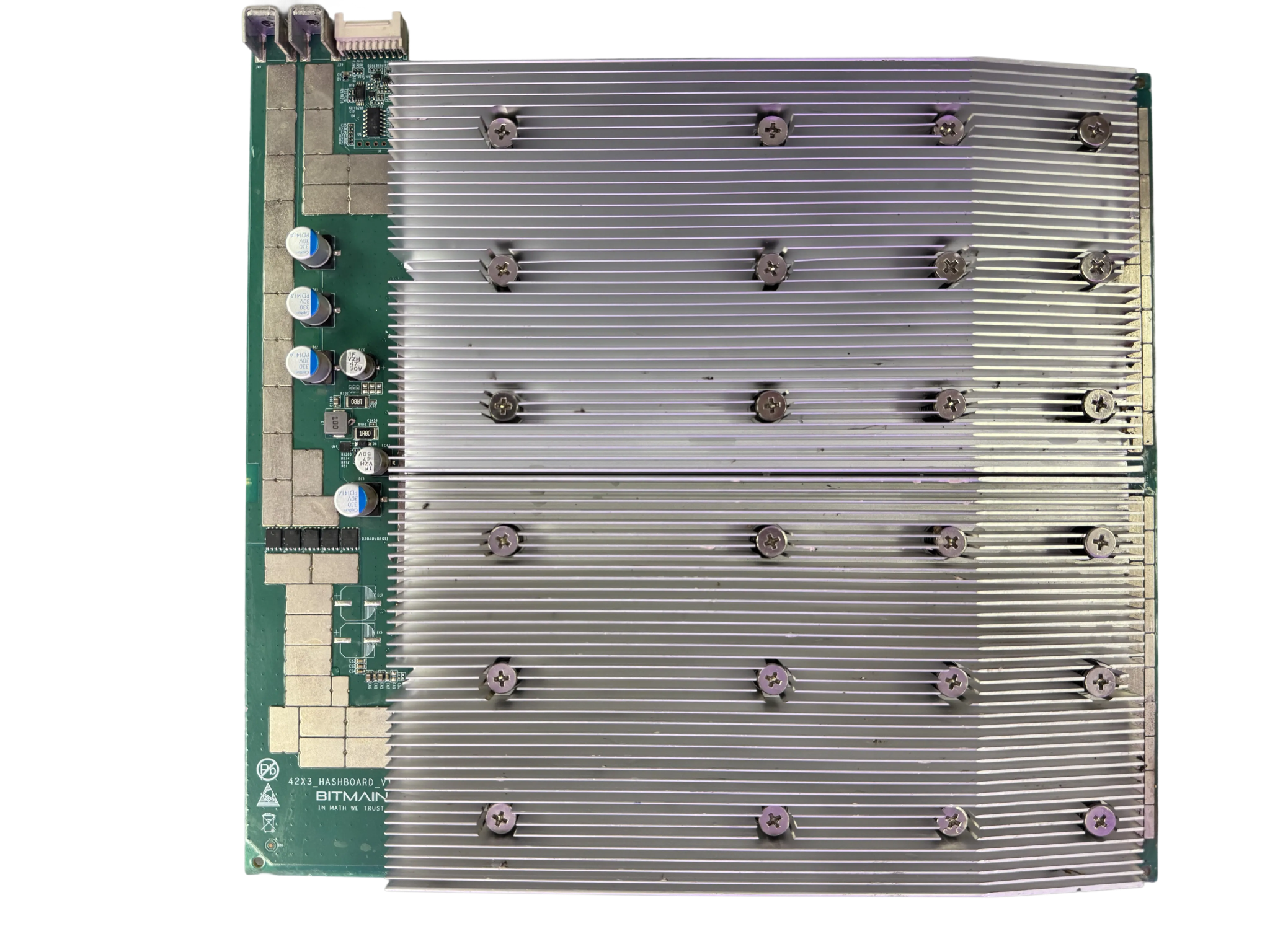 A hashboard is the core processing unit doing the work in a mining machine, populated with multiple ASIC chips that perform SHA-256 computations. Most machines use three hashboards, though this can vary. Each hashboard contains a specific number of ASIC chips arranged in a precise pattern. Different machines use different chip generations, with newer generations typically offering better power efficiency (J/TH).