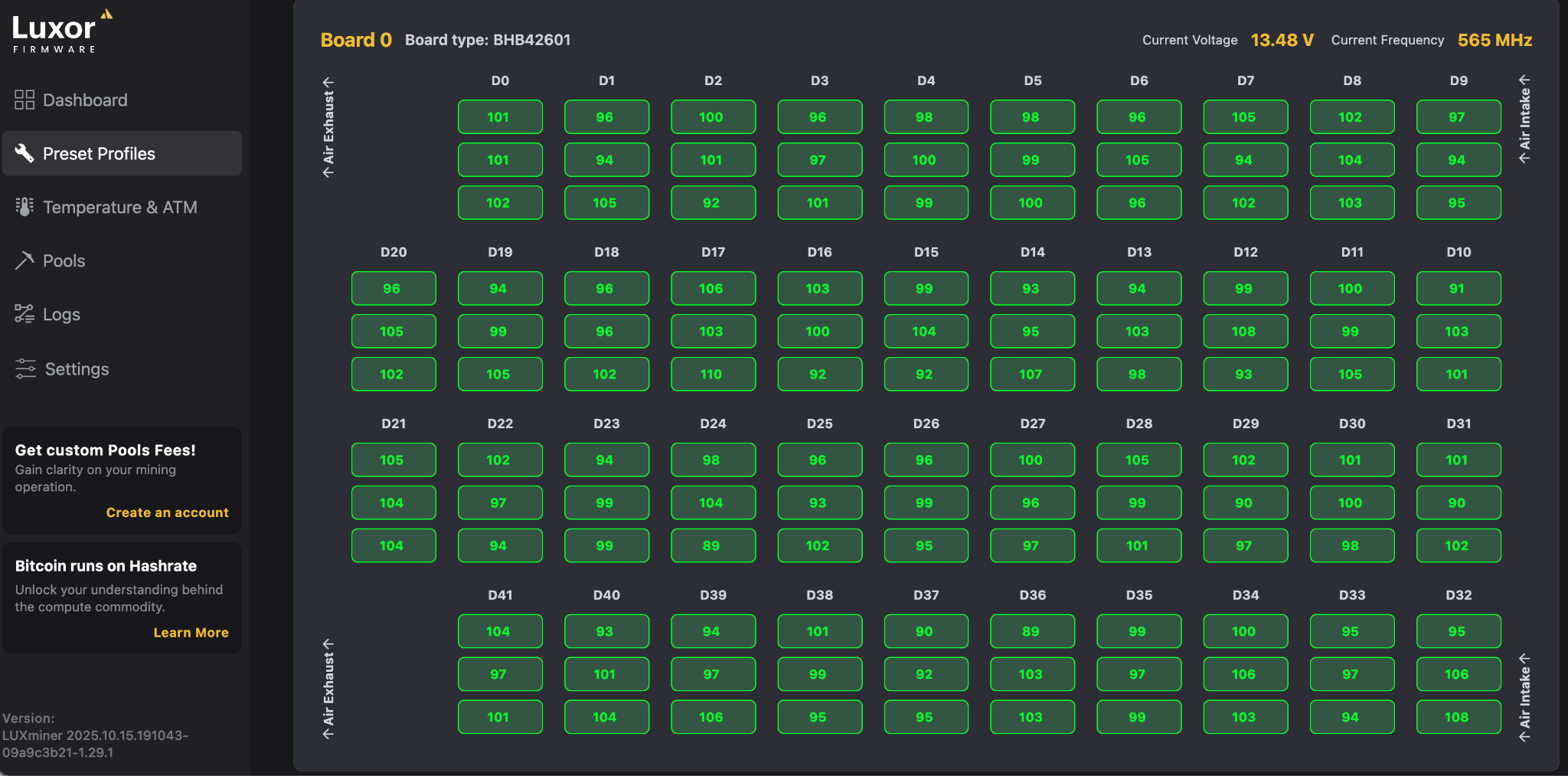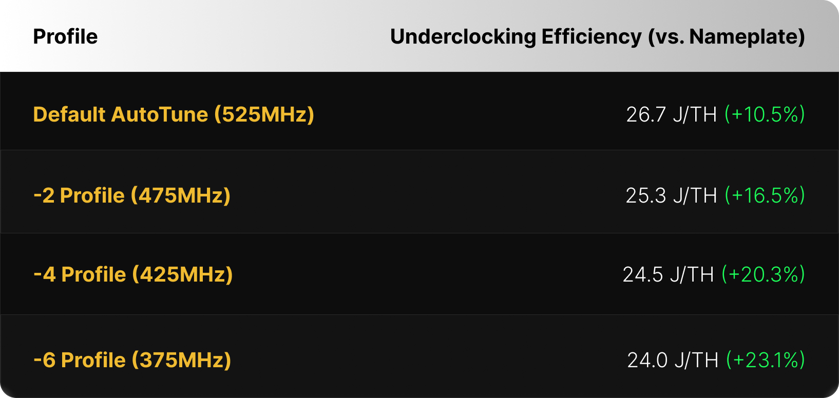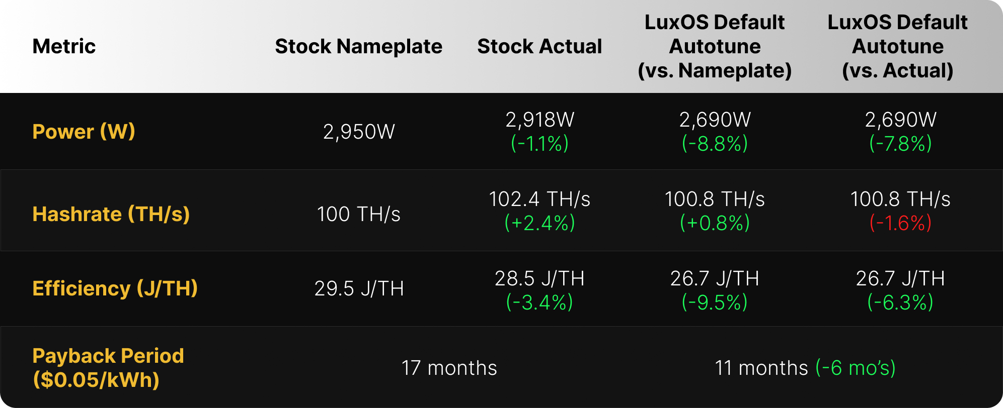 Note: All data sourced from Luxor’s R&D Fleet unless otherwise noted. To ensure accurate and reliable results when testing LuxOS, check out our Best Practices Guide.