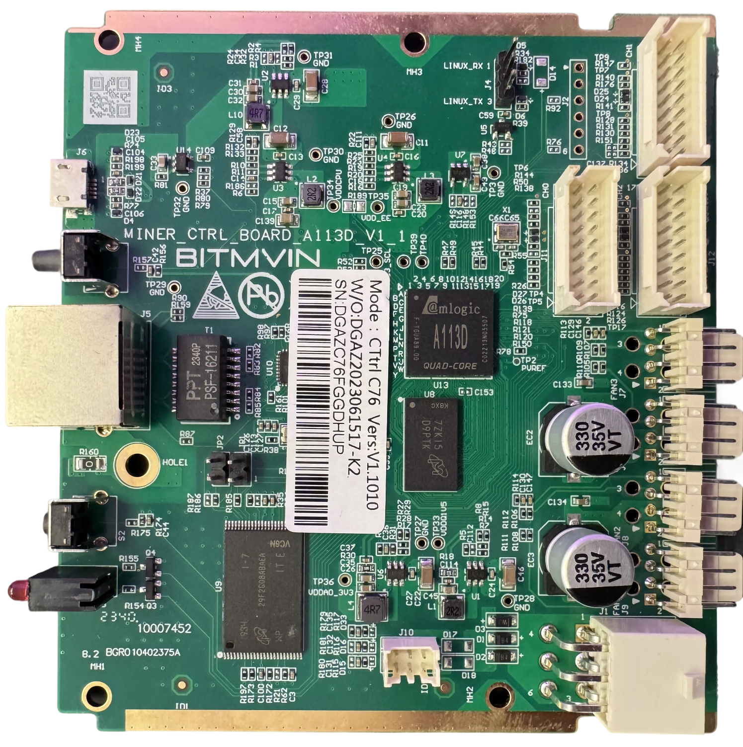 The control board is the central processor of the mining machine. It coordinates hashing operations, manages firmware, communicates with hashboards and sensors, and connects to mining pool infrastructure. Different control board types offer varying processing power, connectivity options, and firmware compatibility.