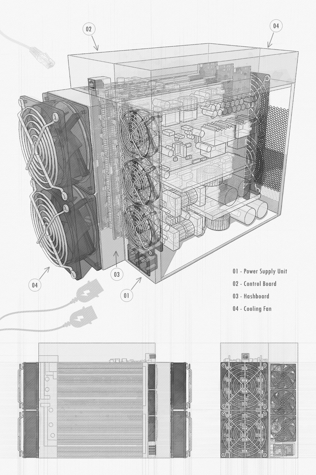 - Power Supply Unit (PSU): converts AC power into regulated DC power that ASIC chips require to work.