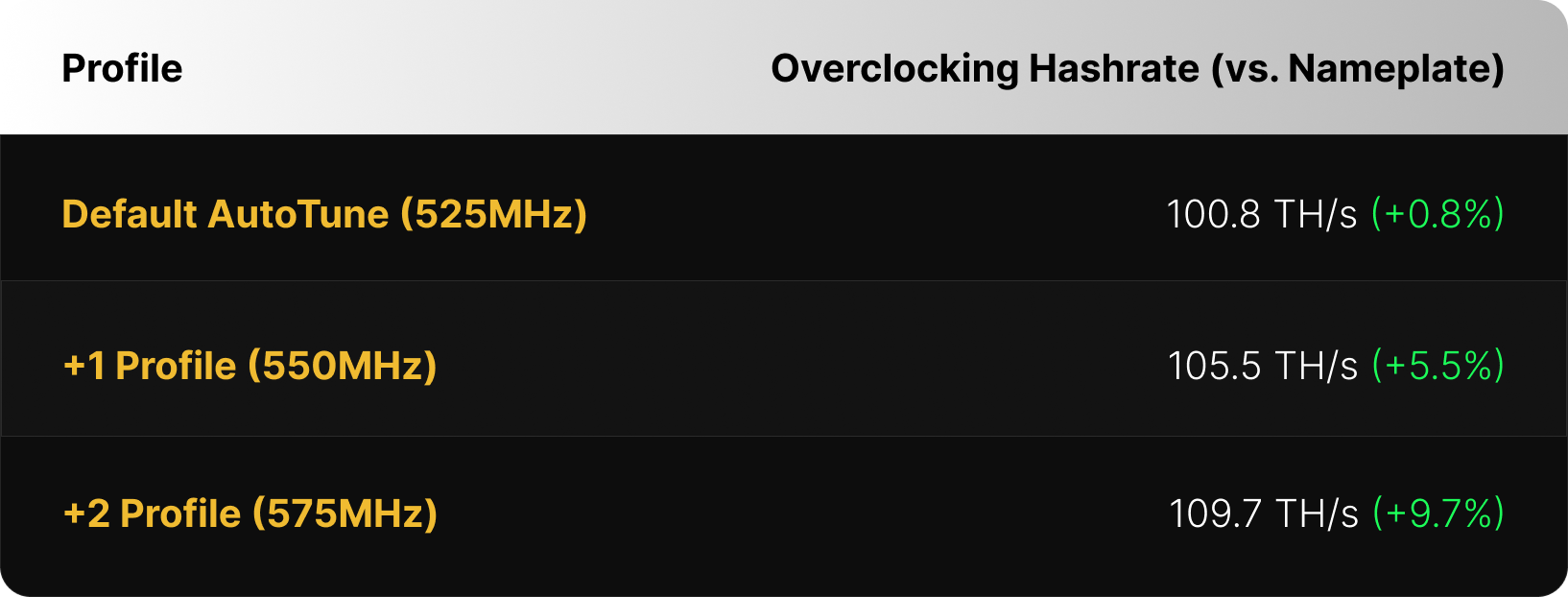- For miners aiming to maximize revenue during periods of high hashprice or low-cost power, the +2 profile pushes hashrate to 109.7 TH/s (+9.7%) with a slight efficiency gain (+3.4)%, though this comes at the cost of higher power draw and thermal stress.