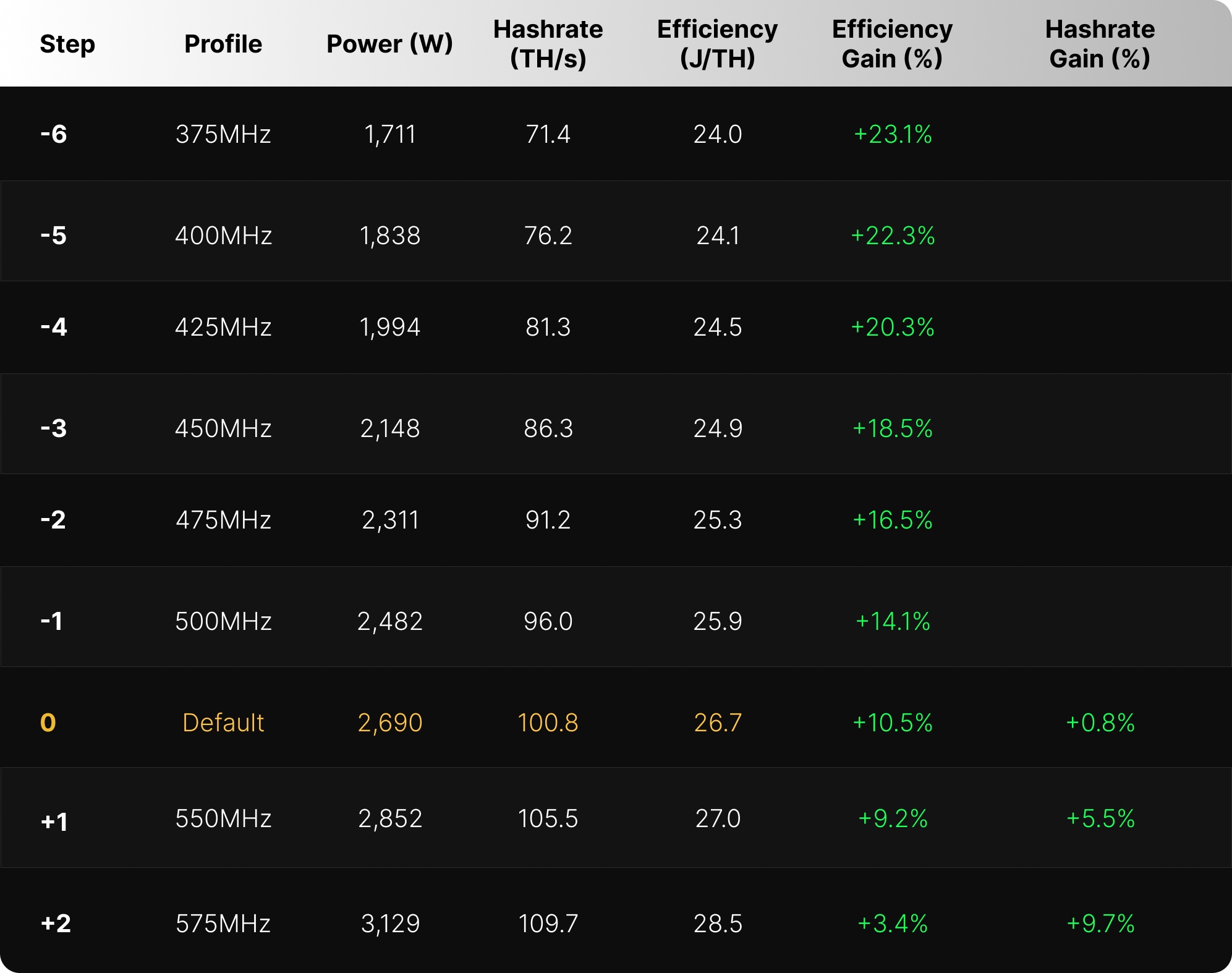 Each profile represents a unique balance between hashrate output, power draw, and electrical efficiency, allowing operators to fine-tune performance parameters based on economics, thermal constraints, or infrastructure limitations. Underclocked profiles (steps -6 to -1) prioritize energy efficiency, making them ideal for environments with high power costs or grid constraints. Conversely, overclocked profiles (steps +1 and +2) boost hashrate production and may be preferable when hashprice is elevated or when Intelligent Mining.