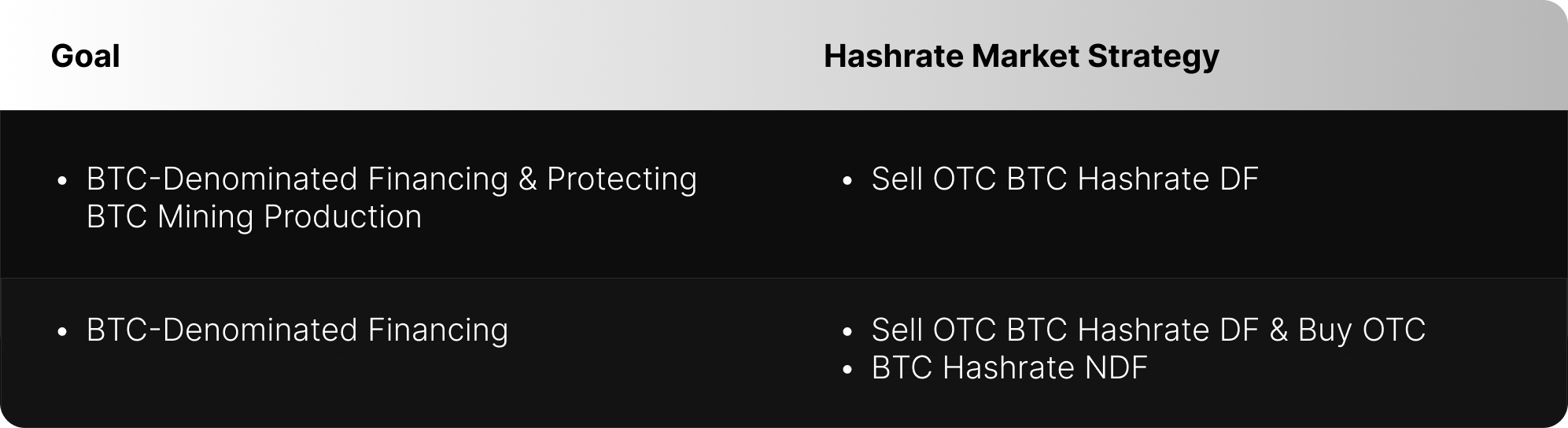 - Fixed Bitcoin Repayment – Secure predictable repayment terms by pairing a deliverable forward sale with a non-deliverable forward purchase. This structure removes hashrate variability from the equation while maintaining exposure to operational upside.