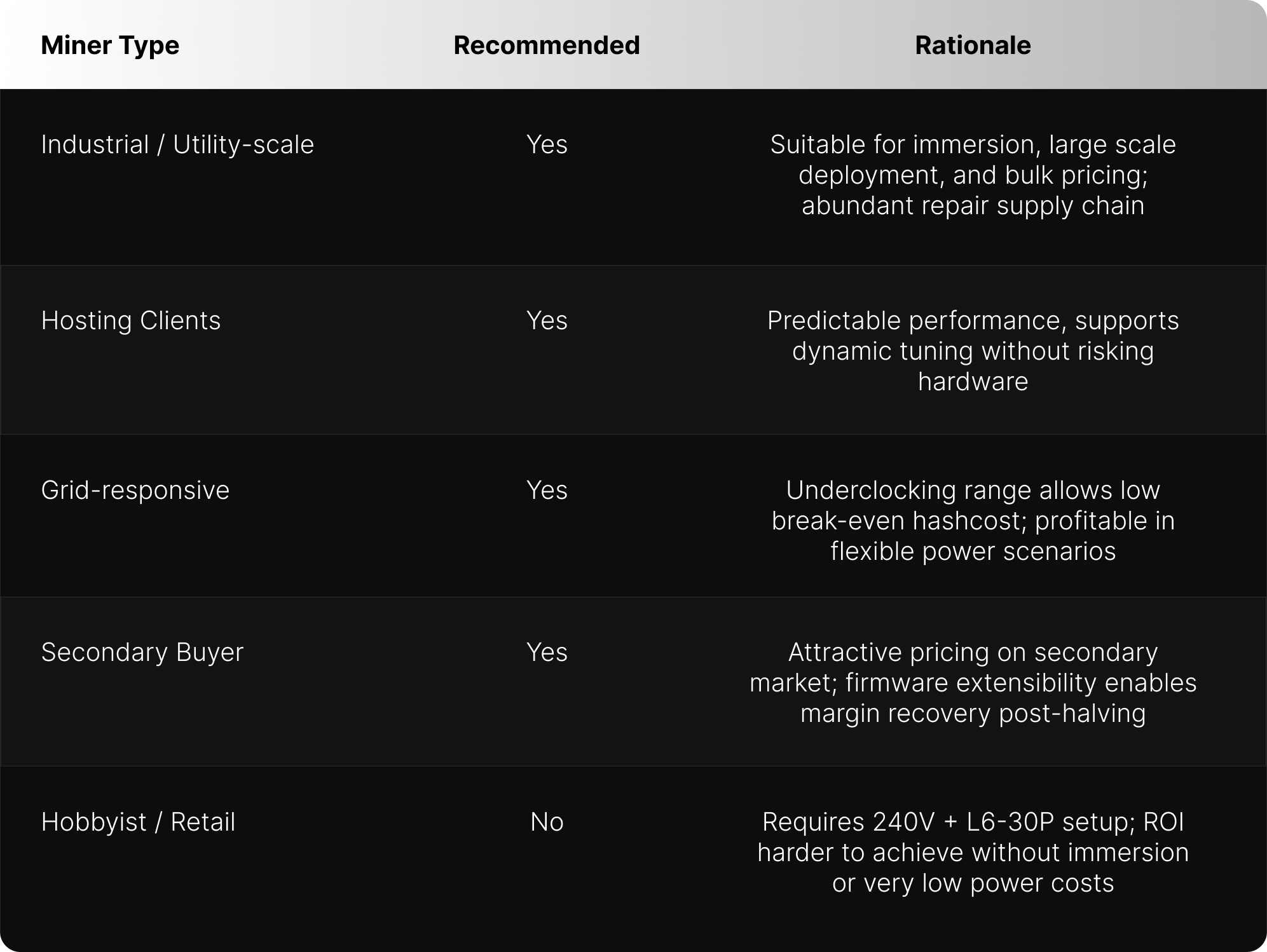 Note: All data sourced from Luxor’s R&D Fleet unless otherwise noted. Operational results may vary depending on deployment environment, firmware, and power supply configuration.