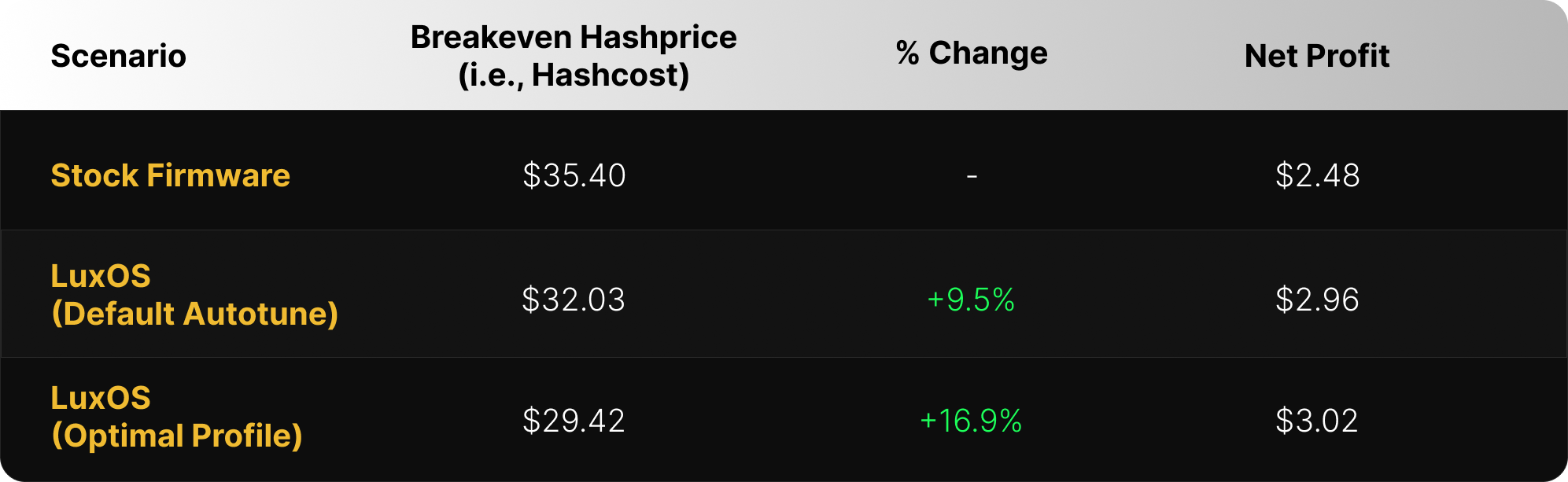 - Switching to LuxOS (Default AutoTune) reduces that breakeven point to $32.03 (+9.5%), a meaningful drop that expands the profitable range of operation.