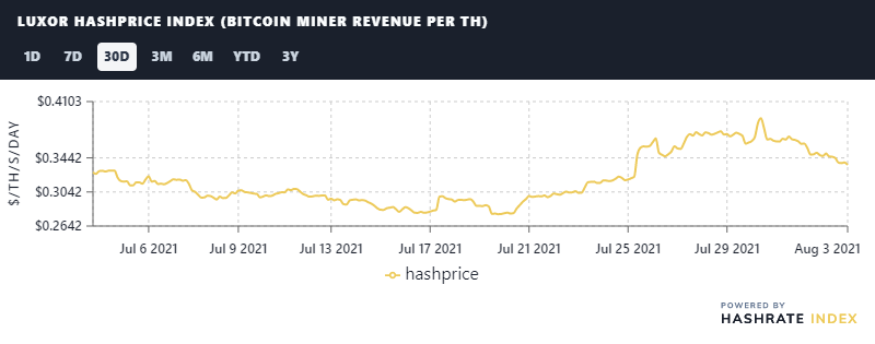 Hashprice: Bitcoin’s hashprice profited from its positive price action last week, though July 31’s difficulty adjustment took it down a peg or two before it could breach $0.40. Currently, Hashprice is $0.33 TH/s/day, just below where it was during last Tuesday’s newsletter.